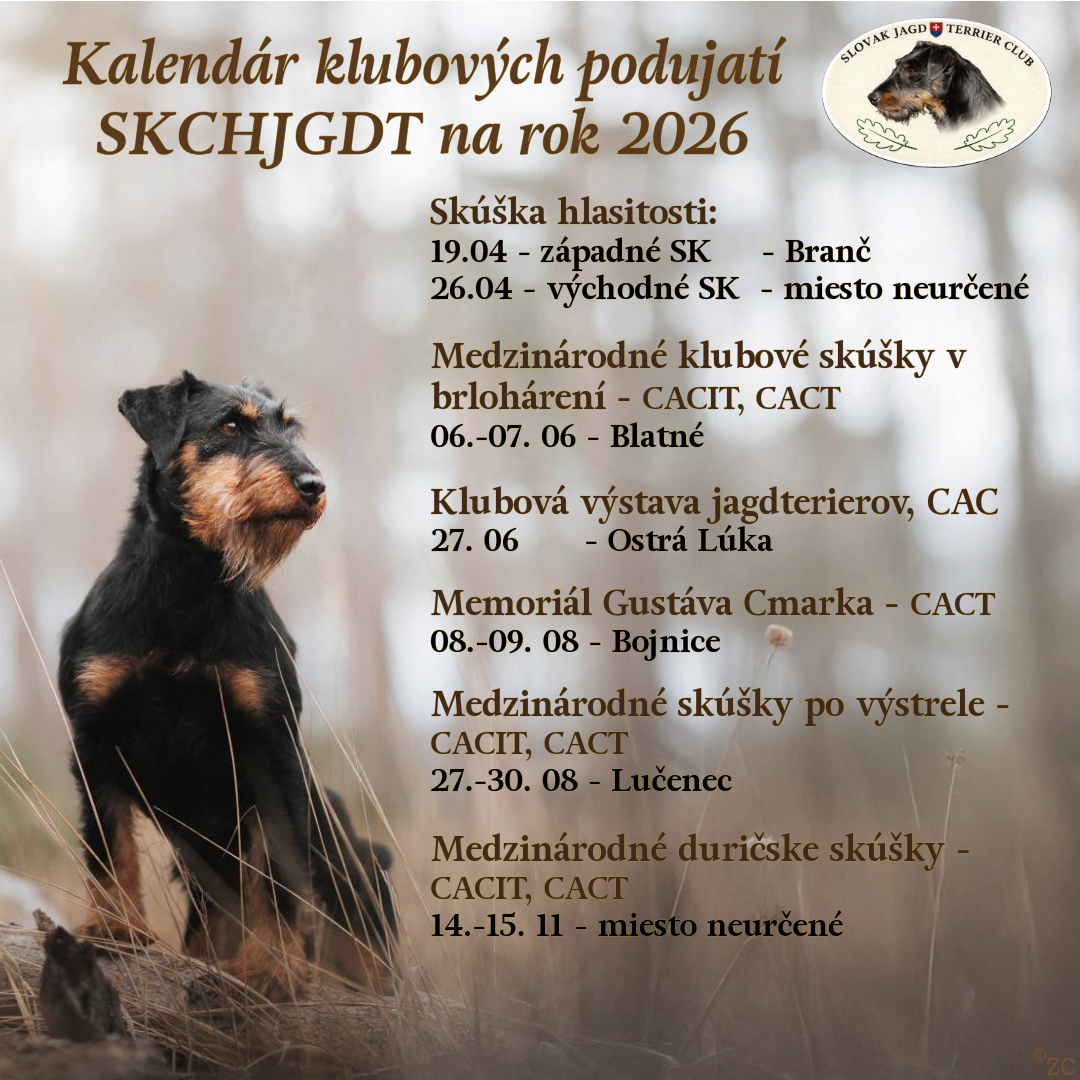 Slovenský klub chovateľov jagdterrierov Vás pozýva na klubové podujatia, ktoré budú organizované v roku 2026.